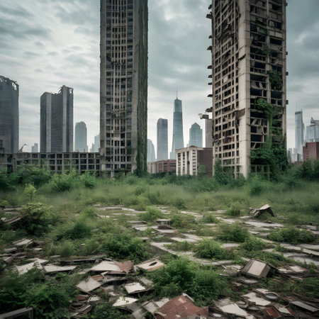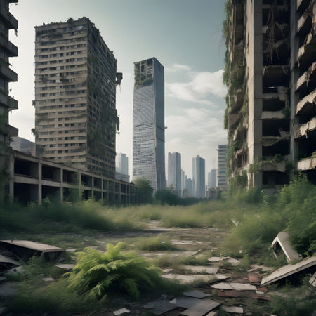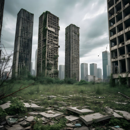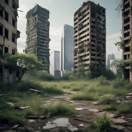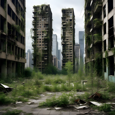 This striking image captures an abandoned urban area with empty high-rise buildings looming over a deserted landscape, showcasing nature's slow reclamation of space.