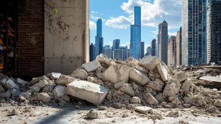 A close-up view of rubble and debris from a demolition site in an urban environment, framed by striking modern skyscrapers under a blue sky.