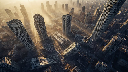 Devastated showing devastated cityscape with collapsed skyscrapers and debris after catastrophe viewed from above. resolution use.