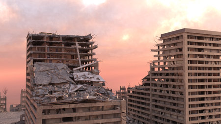 Debris showing post-apocalyptic cityscape with collapsed skyscrapers and debris under a hazy sunset sky with distant buildings. resolution