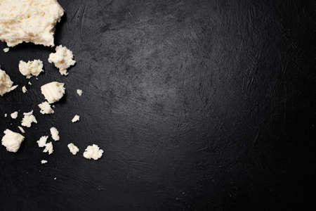 preparation of crumbling feta cheese for a salad on dark background. farming industry. milk products. gourmet food. free space concept