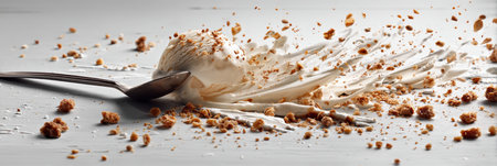 A scoop of melting ice cream rests on a flat white surface, next to a spoon surrounded by scattered crumbs, highlighting a sweet indulgence.