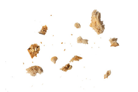 Crumbs of fresh whole grain bread isolated on white background. Isolate crumbs of different sizes for insertion into a design or project.