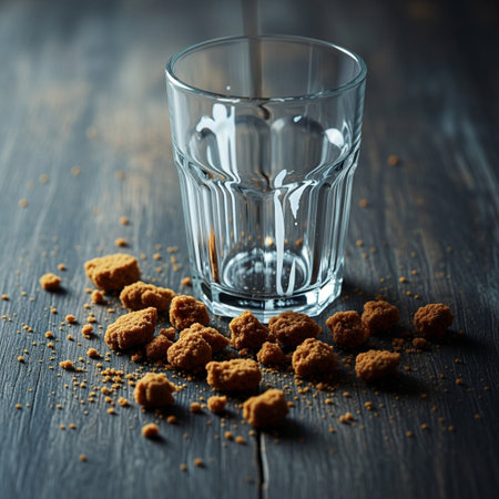 A glass of water and a handful of brown sugar on a dark wooden background