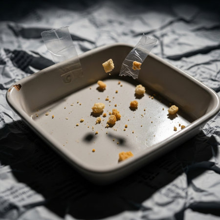Snack crumbs scattered on a vibrant red background