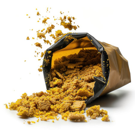 An enticing image of golden crumbs spilling from an open snack bag against a white background. Perfect for showcasing tasty treats and culinary creativity.