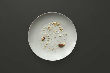 Conceptual image of the end of the holiday. Empty round plate with crumbs on grey background.