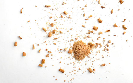 Scattered bread crumbs on white background, closeup