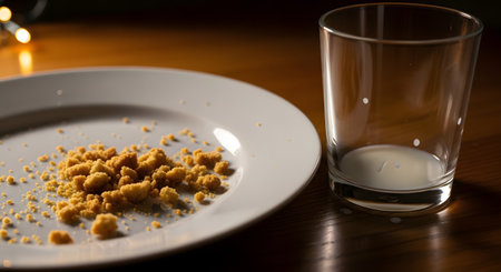 A white plate with leftover cookie crumbs and an almost-empty glass of milk sit on a wooden table. The scene, dimly lit with warm background lights, evokes a sense of finished satisfaction, perhaps after Santa's visit or a late-night snack.