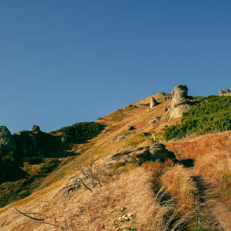 Man sit on top of a mountain and enjoying sunrise. Tired hiker relax and thinking alone in nature.