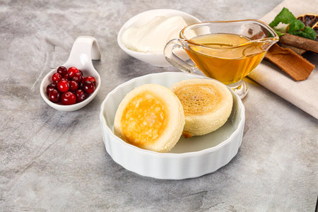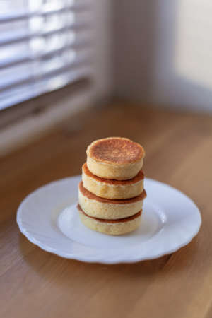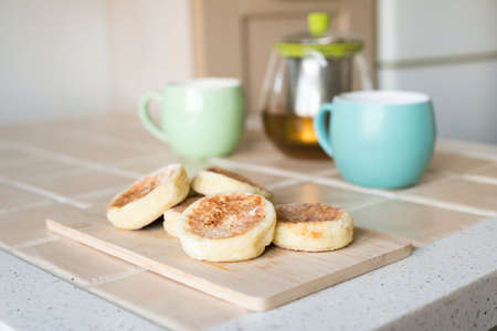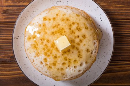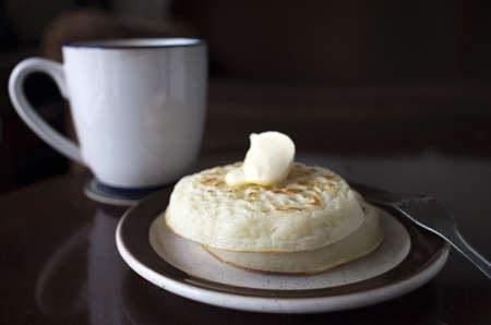 Traditional English skillet fried breakfast pastry Crumpets, popular in England, Britain pancakes. Sweet hot crumpets stack with melting butter and jam