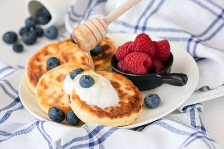 Cottage cheese pancakes or sirniki with sour cream, honey and berries. Closeup view, selective focus. Russian cuisine