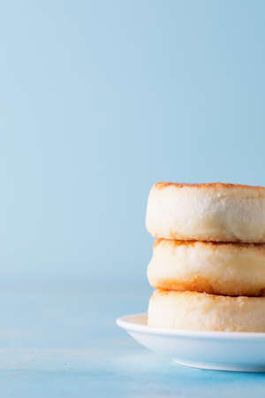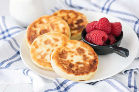 Cottage cheese pancakes on white plate. Also known as syrniki, sirniki or cottage cheese fritters. Russian cuisine