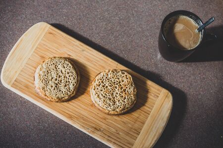 Fresh homemade English muffins with butter. Breakfast. Selective focus