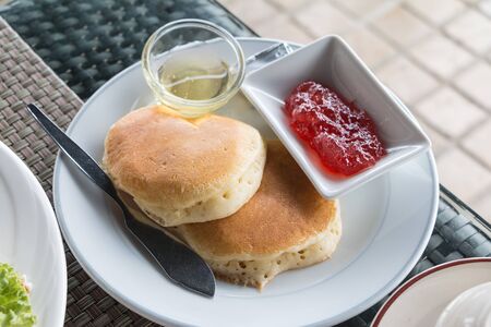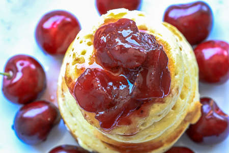 Favorite pancakes with delicious jam for breakfast