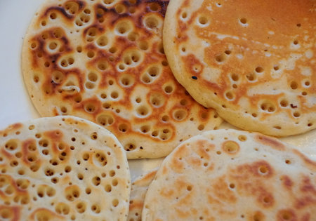 Closeup of English crumpet cake. A crumpet is a griddle cake made from flour and yeast. Food background and texture