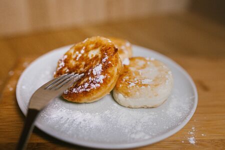 Healthy cheese pancakes sprinkled with powdered sugar prepared with cottage cheese and cooked. Perfect healthy meal for breakfast.Flat lay with copy space.