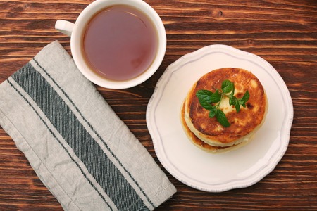 Cottage cheese pancakes. Cheesecakes from cottage cheese, delicious Breakfast, traditional Russian sweet pancakes. With blueberry, mint and honey.