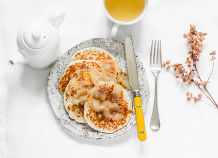 Breakfast in the morning. Cottage cheese pancakes with jam on white plate. Russian, Ukrainian cuisine. Spring flowers