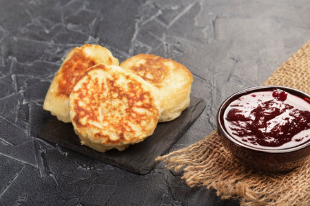 Top view of homemade cottage cheese pancakes- syrniki in a plate, jam on a wooden backdrop. Close up.