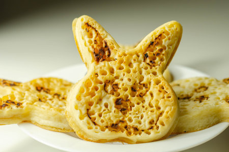 Easter nice bunny shaped crumpets served with raspberry jam, funny food for kids, tasty set