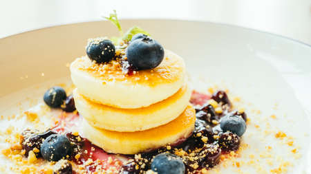 Sweet dessert Pancakes with blueberry and sauce in white plate - Color Filter Processing