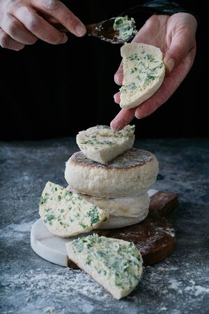 Traditional Portuguese flat circular bread Bolo Do Caco. Female hands buttering the bread. Madeira island cuisine. Selective focus