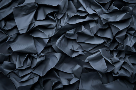 Close-up of abstract dark crumpled fabric texture. The image showcases intricate folds and shadows, offering a dramatic and artistic background suitable for various design projects.