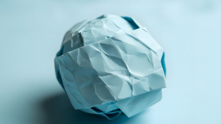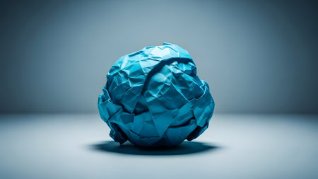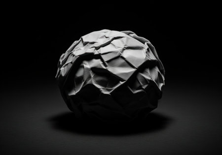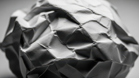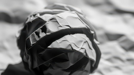 Crumpled dark gray paper ball with intricate folds and creases, dramatically spot lit on a dark surface. strong contrasts and shadows emphasize the rough, organic texture, conveying concepts of waste, ideas, or problems.
