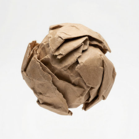 A textured, crumpled brown paper ball suspended in mid-air, showcasing its unique shape and design against a clean white backdrop, perfect for creative projects