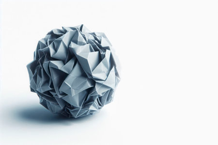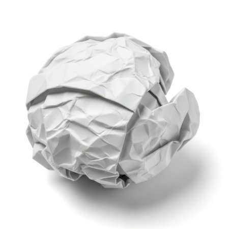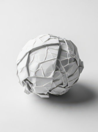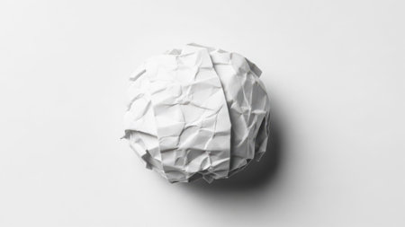 A single, perfectly crumpled paper ball resting on an empty white background, emphasizing simplicity.