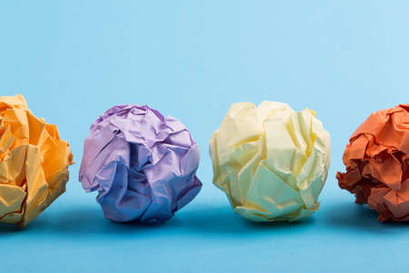 Inspiration or idea concept. A pen with a colorful crumpled paper balls on a blue background.