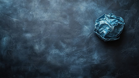 A crumpled piece of blue paper rests on a textured dark surface illustrating contrast and texture in a minimalist setting.