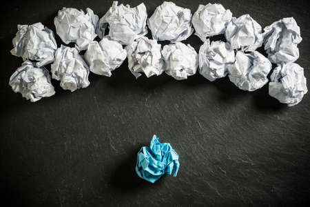 crumpled paper symbolizing different solutions with one standing out with a different color on slate background