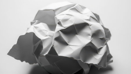 Depict the intricate patterns of light and shadow cast upon a solitary, crumpled paper, illuminated by a single, dramatic spotlight on white --chaos 30 --ar 16:9 --v 6.1 Job ID: c84e28eb-1ef7-451e-890d-3370c6af3575