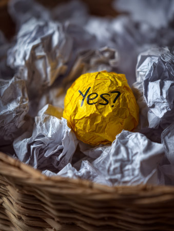 A vibrant yellow note with a questioning message lies amid a jumble of white crumpled sheets, suggesting contemplation or indecision in a cluttered workspace.