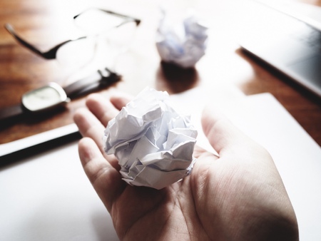 many balls of crumpled paper on a wooden table. search for inspiration, ideas. search difficulties