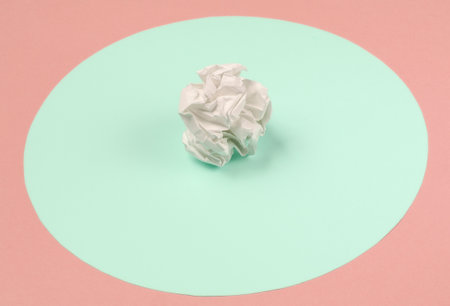 Crumpled Paper Ball on pink background with green pastel circle. Minimalistic business still life.