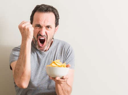 Senior man eating potato chips annoyed and frustrated shouting with anger, crazy and yelling with raised hand, anger concept