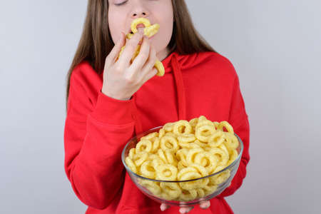 Cropped closeup photo of cheerful happy smiling crazy closing eyes enjoying food fulling mouth with crunchy rings hold plate in hand isolated gray background