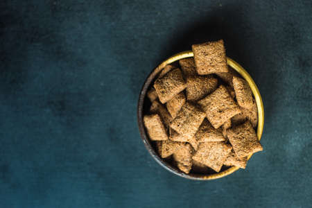 Sweet breakfast cereal dry - chocolate pads made of cereals on a blue background, viewed from above