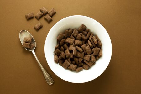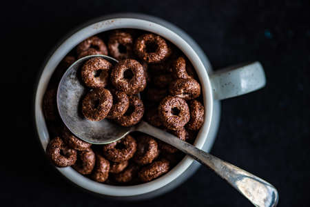 Breakfast ingredient chocolate cereal in a bowl on rustic background with copy space