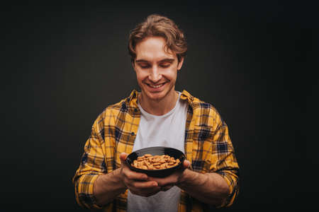 Young blond man in yellow shirt is holding plate of almonds, isolated over black background