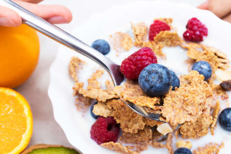 spoon with cereals and fruits, breakfast and healthy snack