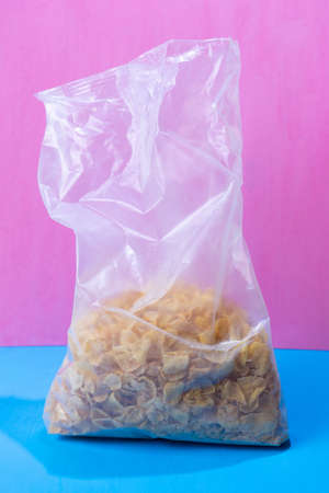 Corn flakes cereal breakfast in plastic bag on colorful background