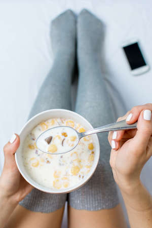 Woman eating cereals in bed top view