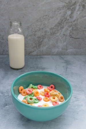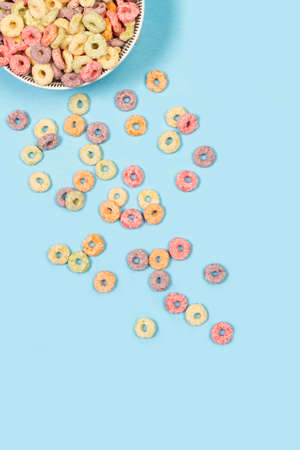 Fruit flavor colored cereals in a bowl and on a light blue background with copy space