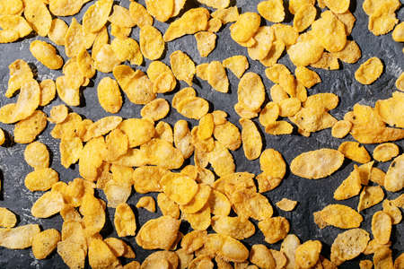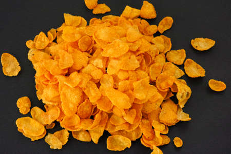 Heap of corn flakes on black background