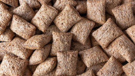 Background of dry breakfast pillows with chocolate filling up close