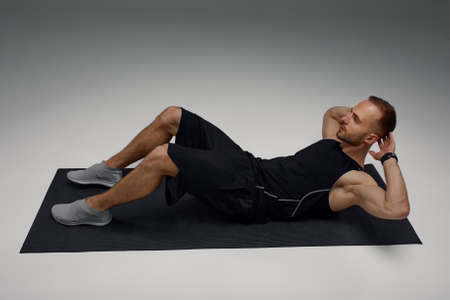 Attractive healthy young sports man stretching on fitness mat indoors, over gray wall background